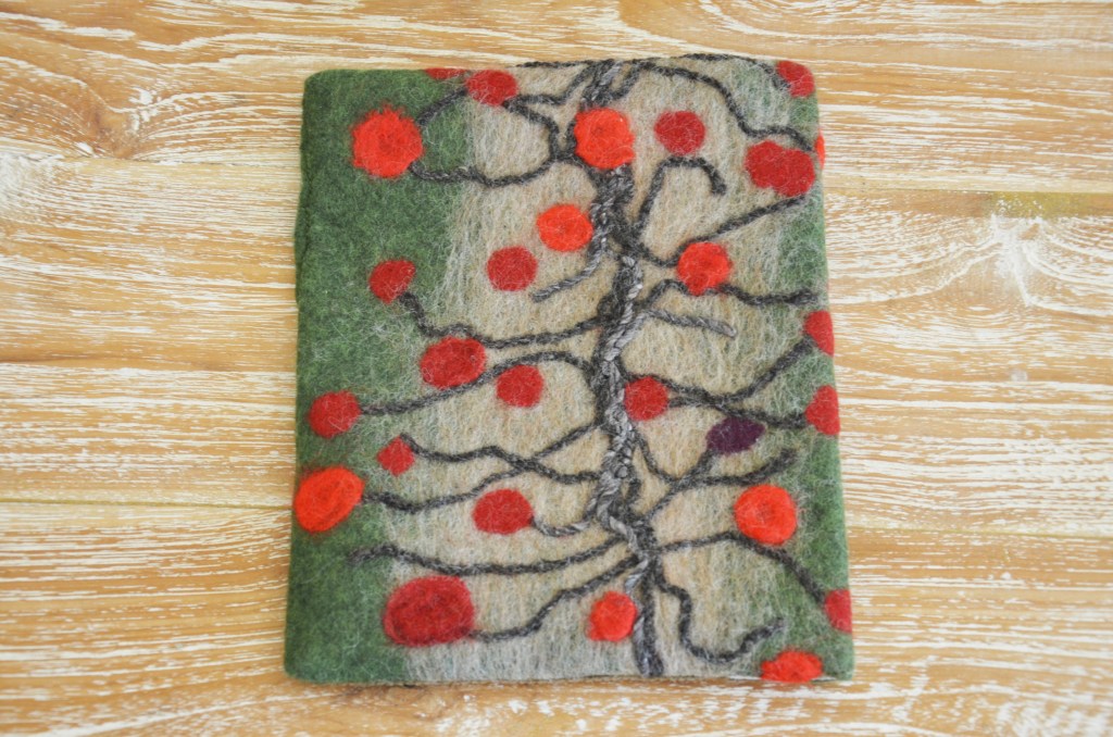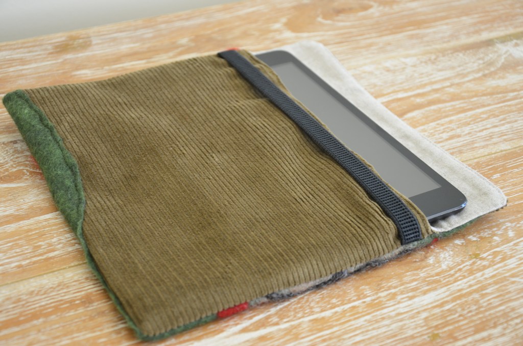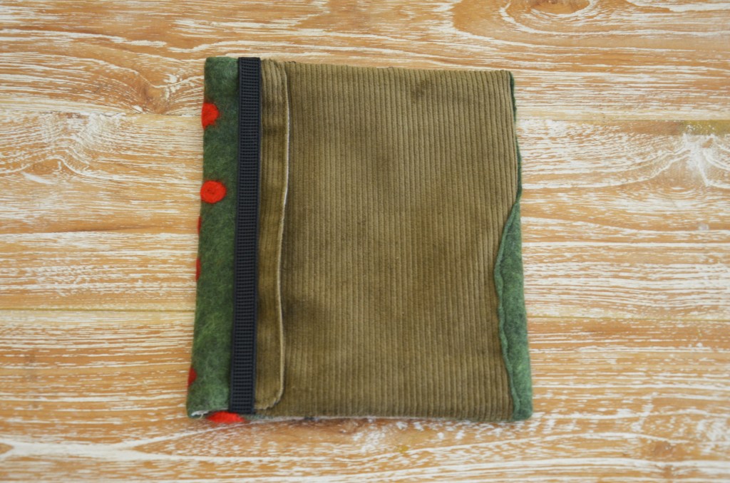 Hand felted pouch with corduroy back and unbleached cloth lining. Elastic closure. Suitable for mini iPad. L21.5cm W18cm