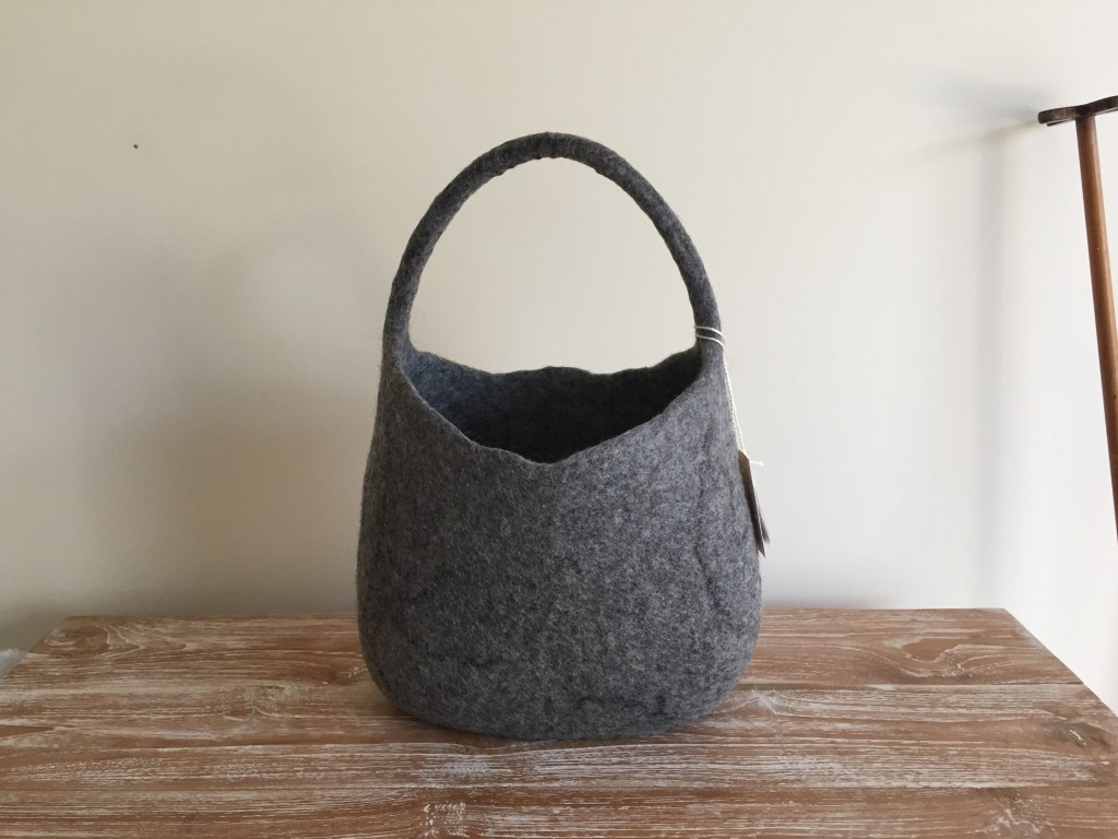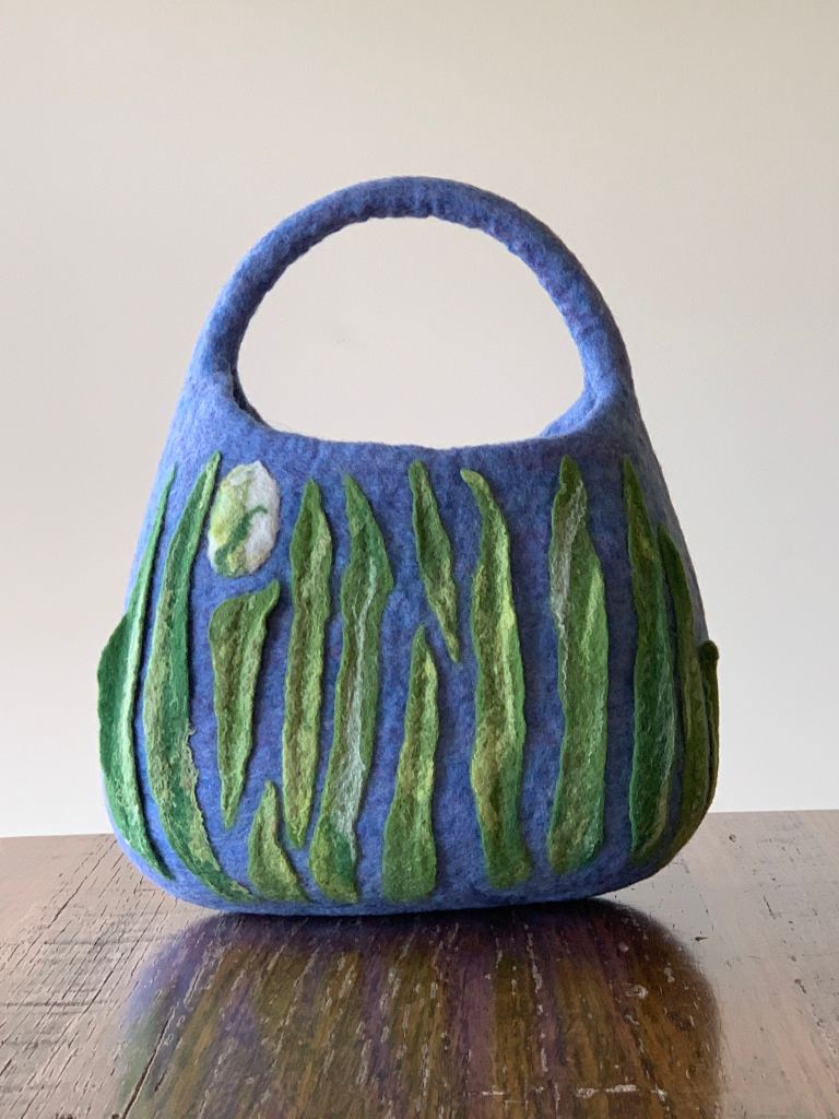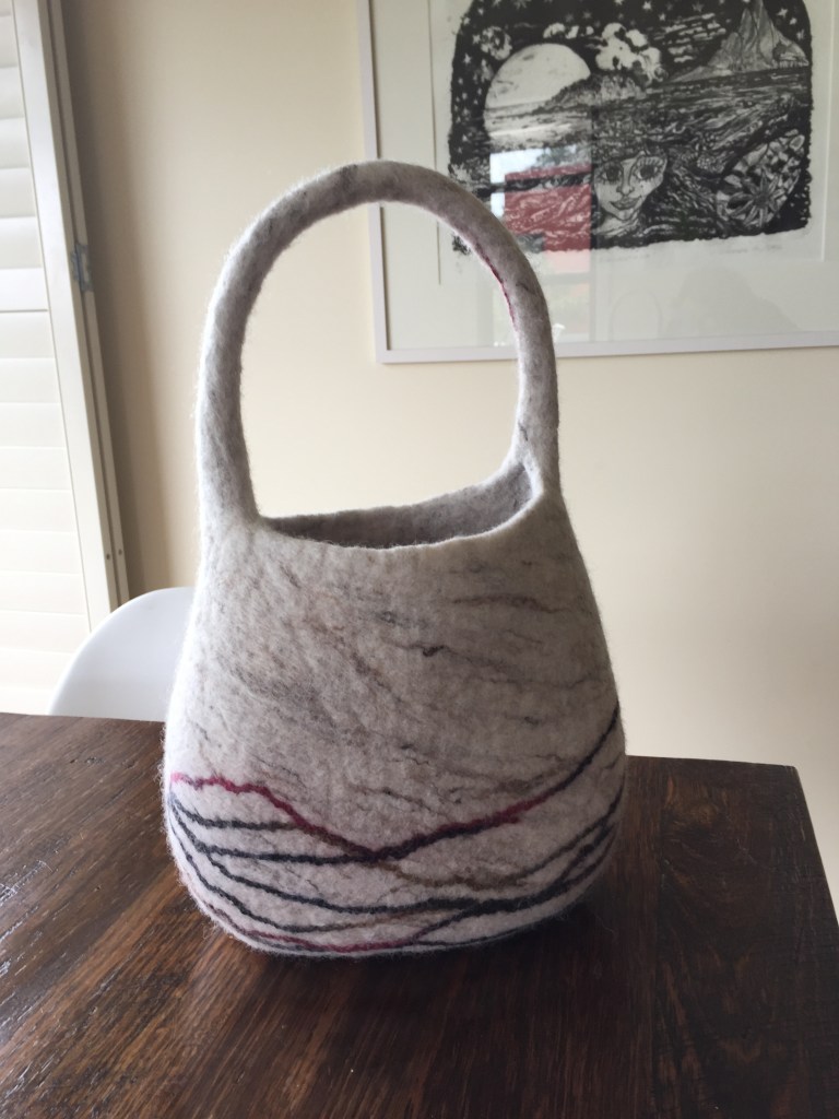 Australian 100% Merino Wool Bag with merino/silk embellishment. Internal measurements H cm, W cm, D cm.