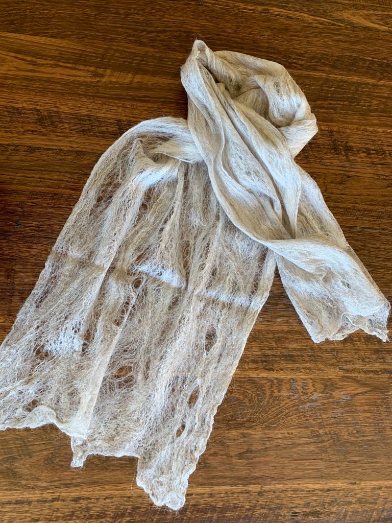 This luxuriously soft scarf is a blend of cashmere, angora, qiviut and merino fibres. Bone/ light grey/off white colours. 175cm x 41cm