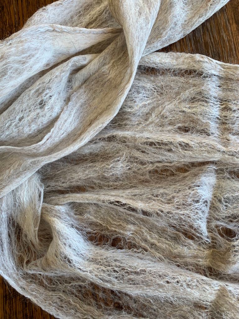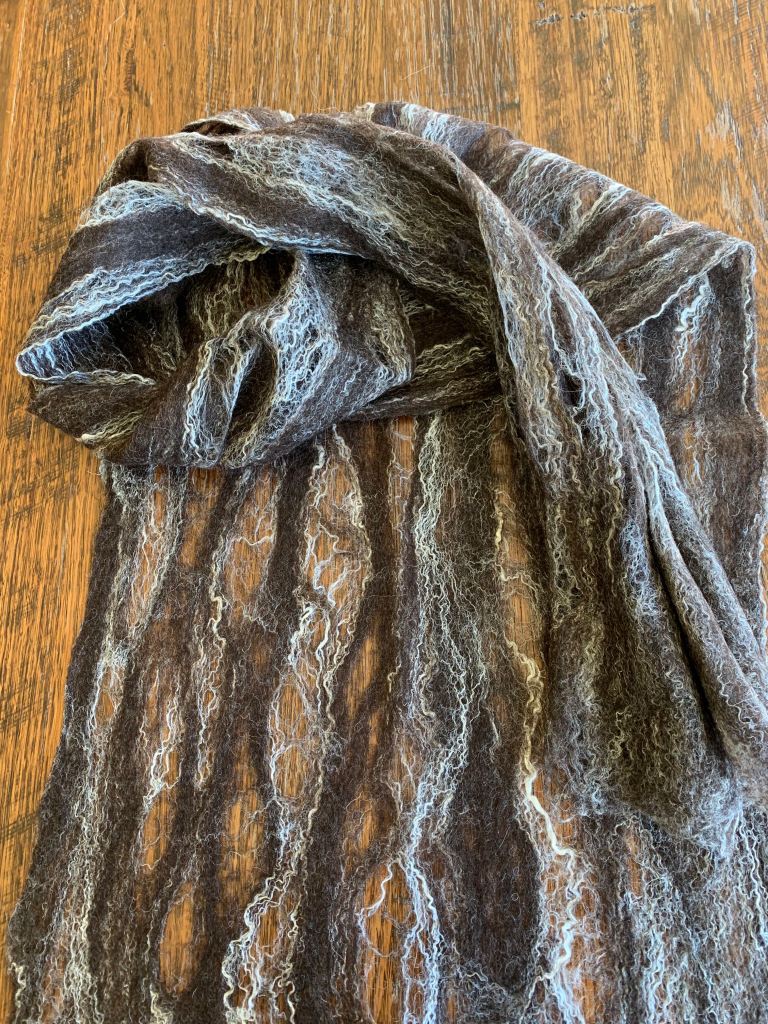 The merino, silk and angora blend makes this scarf soft and scrunchy as a scarf or light and floaty for a shawl.