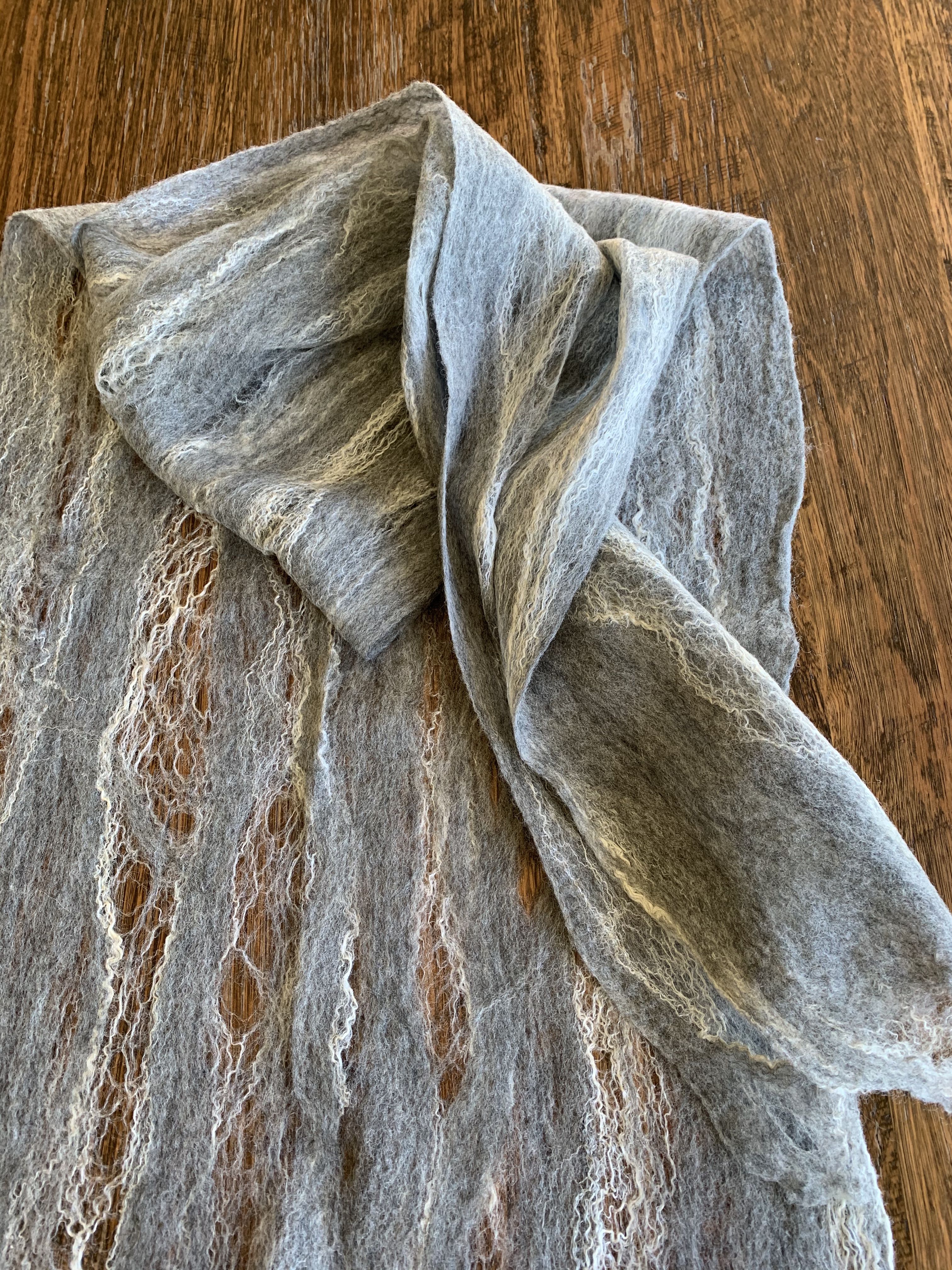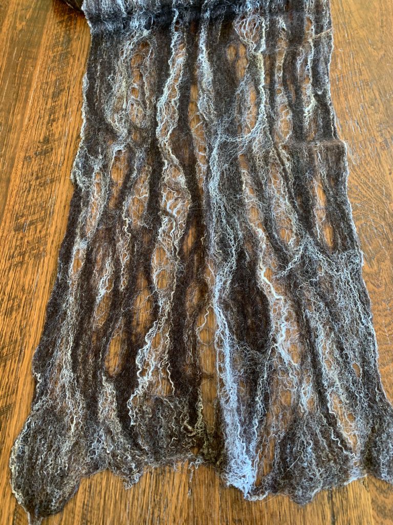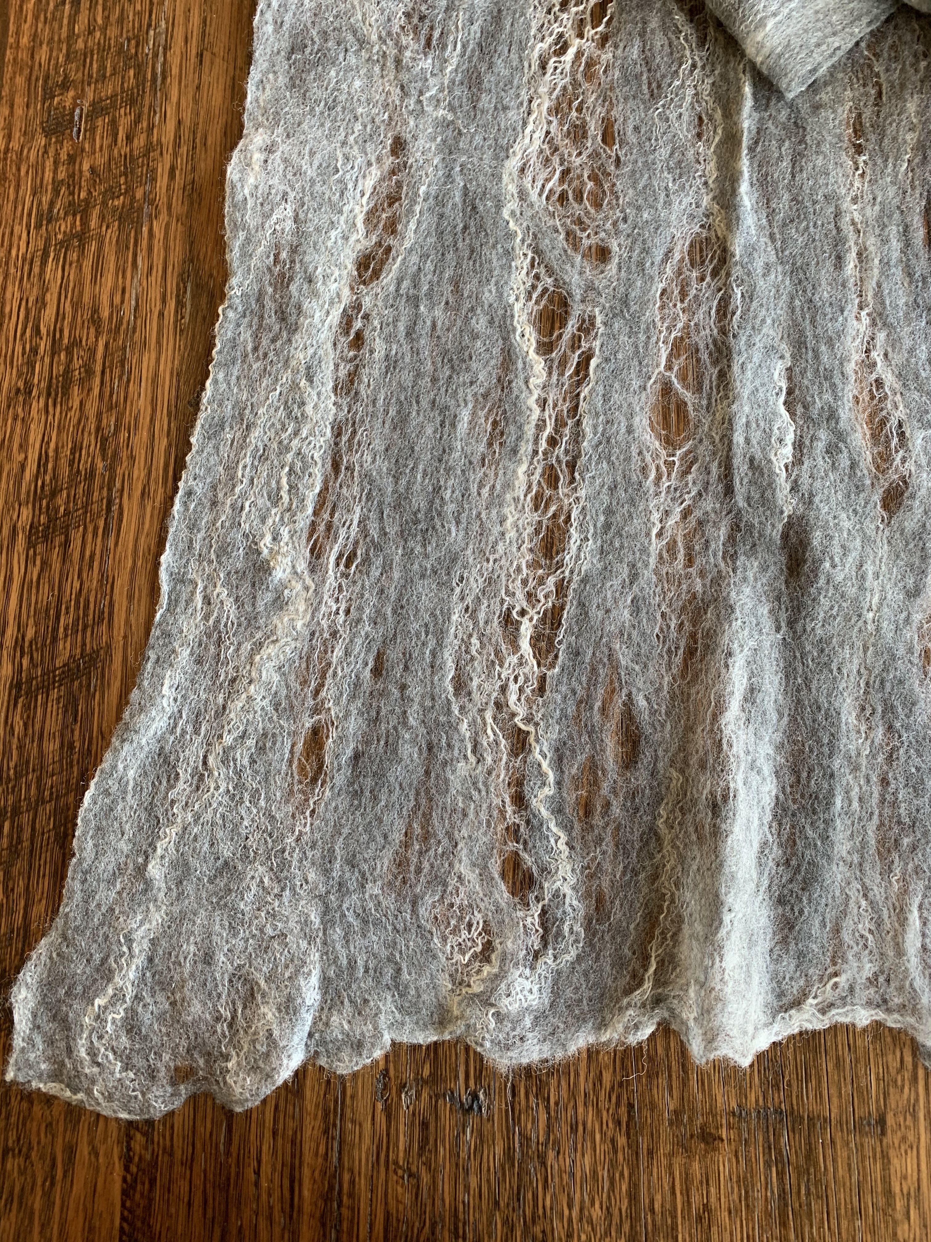 Shetland wool is not talked about so much but is makes this scarf super lofty. Charcoal shetland combined with white tussah silk has created some fabulous holes and patterns. 174cm x 40cm (approximately)
