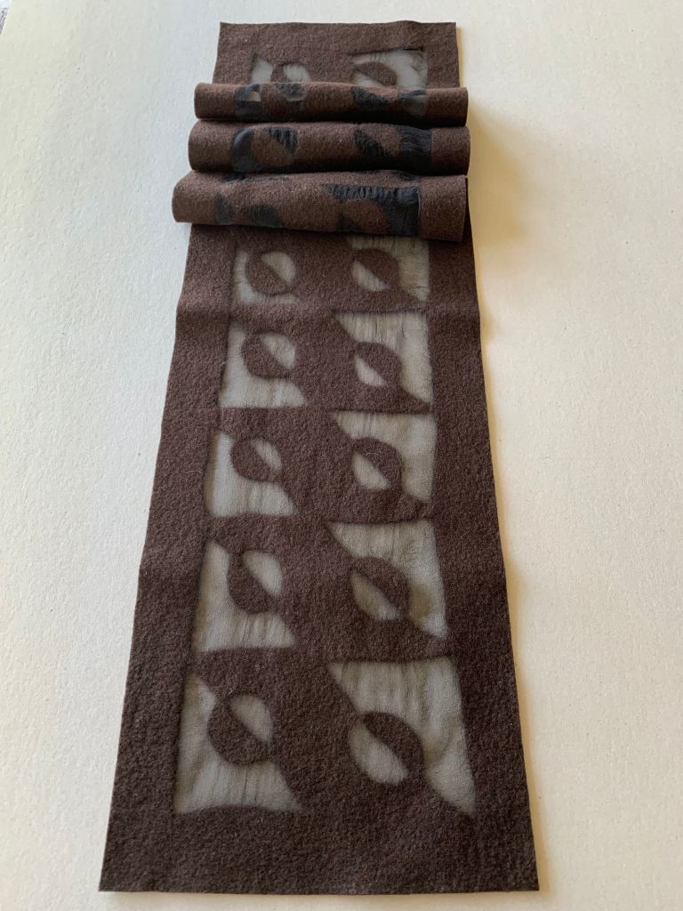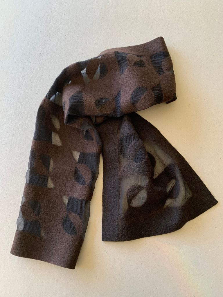 A slim scarf with chocolate brown merino on very light black chiffon. 120cm x 24cm