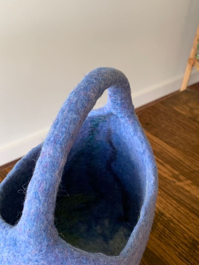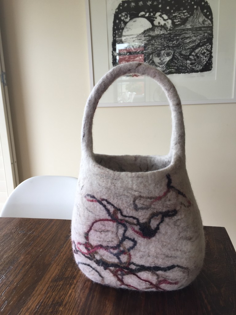 100% Merino Wool sculpted felt bag with multi coloured yarn embellishment.