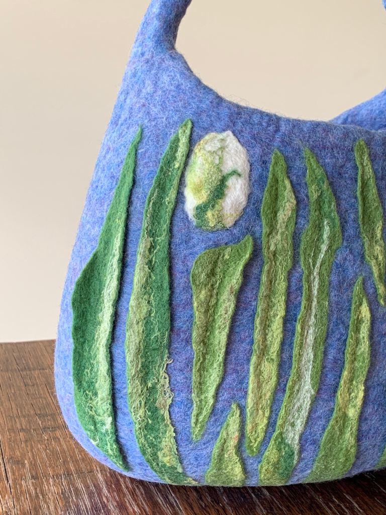 Spring bag was created to reflect the colours and sentiment of the coming of spring after a long cold winter. The semi relief embellishment was sculpted into the bag from the very beginning. This feature made it more challenging to create, but also more rewarding. This piece is completely unique.